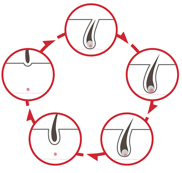 女性の薄毛の特徴は、毛にコシがなくなっていくこと、そして全体の髪の量が少なくなっていくことがあげられます。男性の場合は頭頂部や額の生え際が薄くなりますが、女性の場合は全体的に薄くなるのが特徴です。髪の毛は毛が成長する成長期、成長が止まる退行期、抜け落ちる休止期の3つのヘアサイクルを繰り返しています。このヘアサイクルが乱れることによって毛髪が失われていきます。よって、抜け毛を防ぐにはヘアサイクルを正しくすることが重要になってきます。女性の場合は、ホルモンのバランスが乱れることや、ストレス、ダイエット、睡眠不足などが原因でヘアサイクルが乱れがちです。これらの原因物質を排除することによって、ヘアサイクルが正しく機能するようになります。